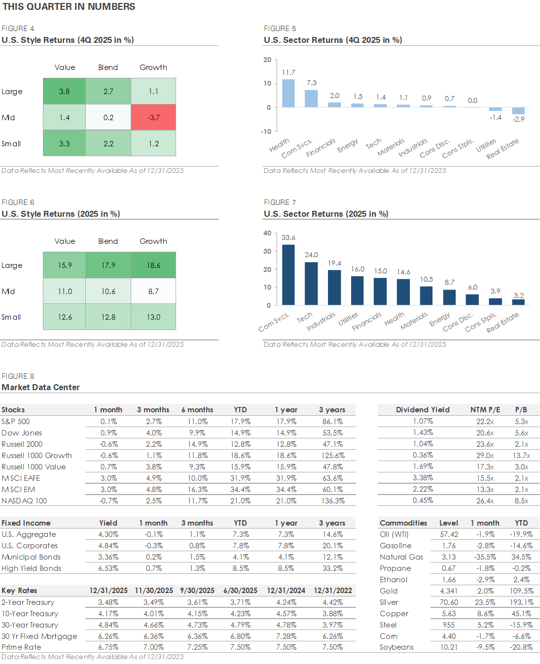 As we turn the page to 2026, it’s important to keep the big picture in mind. Markets have delivered impressive returns over the past five years, but each year brings its own surprises. We can’t predict what lies ahead, but we believe a disciplined approach focused on long-term goals, diversification, and risk management is the best way to navigate the market. Our team will continue to closely monitor incoming economic data and evolving market trends to help ensure portfolios remain aligned with your long-term objectives, regardless of what the market does in the short term.